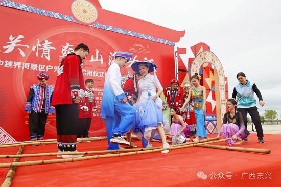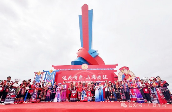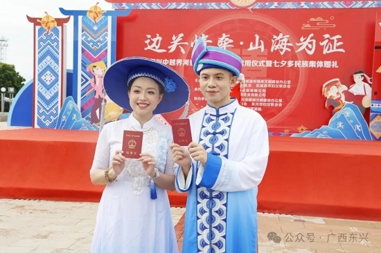 8月29日,“边关情牵·山海为证”——东兴中越界河景区户外颁证点启用仪式暨七夕多民族集体婚礼在竹山山海相连地标广场举行,来自壮族、侗族、仡佬族、毛南族、彝族、瑶族、京族等少数民族的16对新人,身着各自民族服饰,在祖国壮丽的海疆边境许下爱情誓言,这场传统与现代交融的婚俗仪式,为传统婚俗注入时代新意。